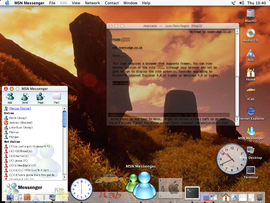 OS: Mac OS X This is me viewing your website in lynx in a transparent term window. I don't usually have it that transparent, but it looks good. Click here to return to the previous page. |