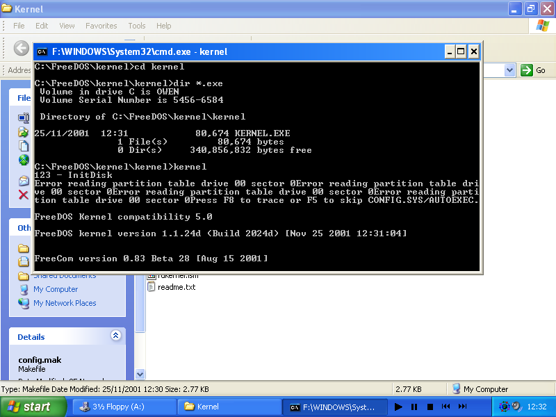 The FreeDOS kernel booting inside the XP DOS virtual machine!