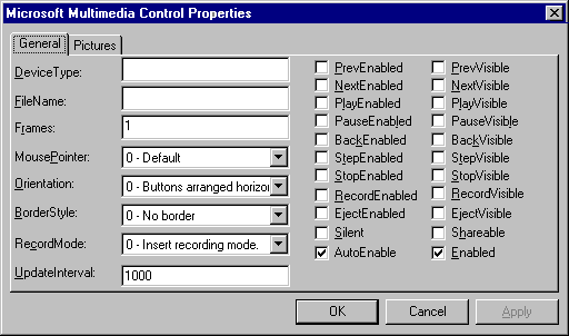 4. Add an MCI control to the form. Click Custom... in the Properties window for the MCI control and set the values as follows: